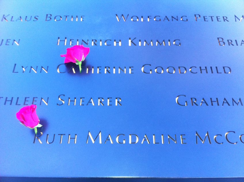 Anderen lopen er, net als ik, heel stil bij. Ik durf eerst de namen niet te lezen. Ik probeer de site als een geheel te zien. Als ik rozen van verwanten zie steken in namen op de rand loop ik snel voorbij. Ik wil niet emotioneel worden. Maar bij het volgende groepje bloemen ga ik er toch naar toe. Ik lees Flanigan en stel me een Ierse man voor, bij Suarez een Mexicaanse vrouw. Ook bij de Frans, Duits of Nederlands klinkende namen haal ik me prototypes van mensen voor de geest. Namen moeten gezichten krijgen. Al zijn het fictieve. Dan zie ik een Jane en een Rebecca met dezelfde familienaam. Er is een roos voor elk van hen en ik krijg tranen in mijn ogen.